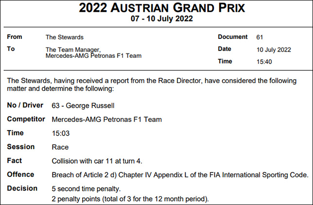 Рассмотрев по ходу гонки инциденты с участием Пьера Гасли и Джорджа Расселла, стюарды Гран При Австрии наказали гонщиков не только пятисекундным штрафом, но и двумя штрафными баллами к суперлицензии.