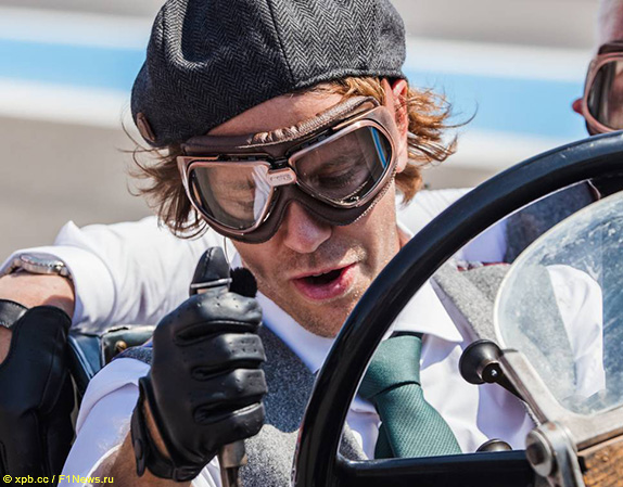 А вот машины Aston Martin до финиша не добрались, лучшая из них смогла проехать 44 круга и сошла с дистанции из-за поломки двигателя, но это дела давно минувших дней. А сегодня Себастьян не просто сел за руль исторической машины, но даже примерил костюм по моде того времени в память о событиях далёкой эпохи.