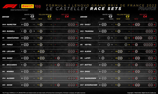 Перед стартом Гран При Франции пресс-служба Pirelli опубликовала информацию об оставшихся у гонщиков комплектах шин.