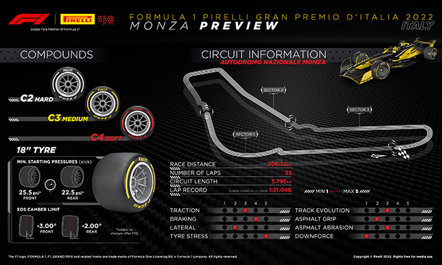 Трасса в Монце известна высокими скоростями и быстрыми поворотами, где важен оптимальный баланс. Шины 2022 года позволят снизить перегрев в задней части машин на трассе, где гонщики настраивают машины на минимальную прижимную силу и часто используют слипстрим, чтобы получить преимущество.