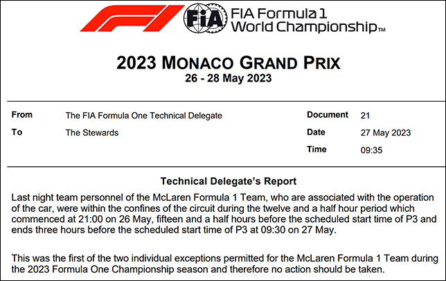 Для McLaren это первое из двух индивидуальных исключений на сезон, поэтому штрафных санкций не последует.