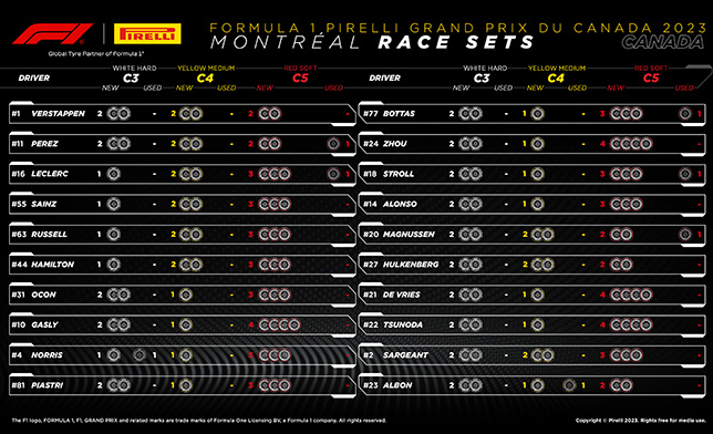 Перед стартом Гран При Канады пресс-служба Pirelli опубликовала информацию об оставшихся у гонщиков комплектах шин.