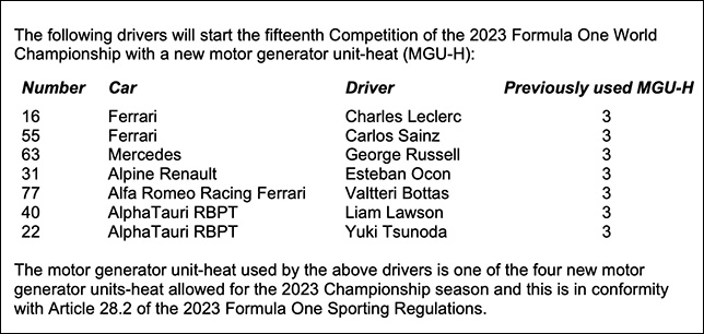 Шарль Леклер, Карлос Сайнс, Джордж Расселл, Эстебан Окон, Валттери Боттас, Лиам Лоусон и Юки Цунода получили новые двигатели внутреннего сгорания, турбины, MGU-H и MGU-К (не все), и новые выхлопные системы.