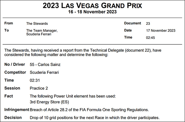 Признав, что повреждение машины Карлоса Сайнса в первой тренировке вызвано влиянием независящих от него факторов, стюарды Гран При Лас-Вегаса выполнили требования регламента.