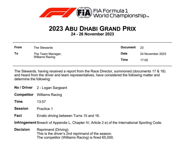 Нарушение американского гонщика Williams было зафиксировано на том же участке трассы, т.е. между 15-м и 16-м поворотами, но формулировка несколько иная: «ошибочные действия на трассе». За это Сарджент получил предупреждение (это его второе предупреждение за сезон), а команда оштрафована на такую же сумму – 5 тысяч евро.