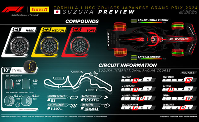 На этап 2024 года компания Pirelli привезла тройку самых жёстких составов – С1, С2 и С3. Точно такой же выбор был и на первом этапе сезона в Бахрейне. Итальянские шинники считают, что самые жёсткие шины – оптимальный вариант для Сузуки с точки зрения износа из-за высокой абразивности асфальта и с точки зрения нагрузок, которые действуют на резину в быстрых поворотах по ходу всего круга.