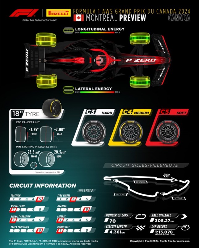 После двух европейских Гран При Формула 1 отправилась за океан, в Канаду, и к этапу на монреальском автодроме имени Жиля Вильнёва шинники Pirelli подготовили резину таких же самых мягких составов, что использовались в Имоле и Монако. Т.е., как и в прошлом году, C3 будет в роли Hard, С4 – Medium, C5 – Soft.