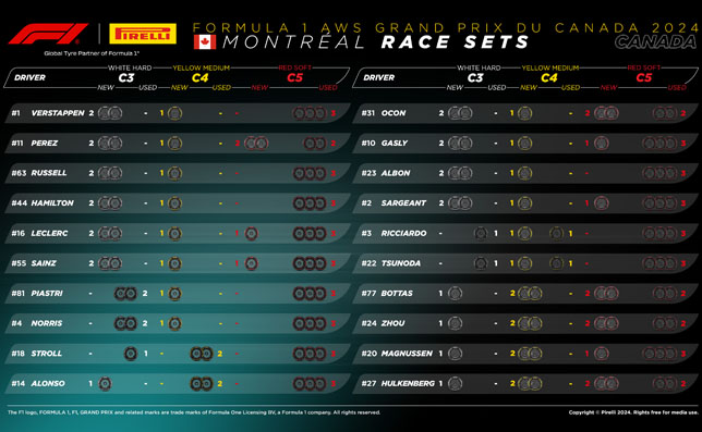 Перед стартом Гран При Канады пресс-служба Pirelli опубликовала информацию об оставшихся у гонщиков комплектах шин.