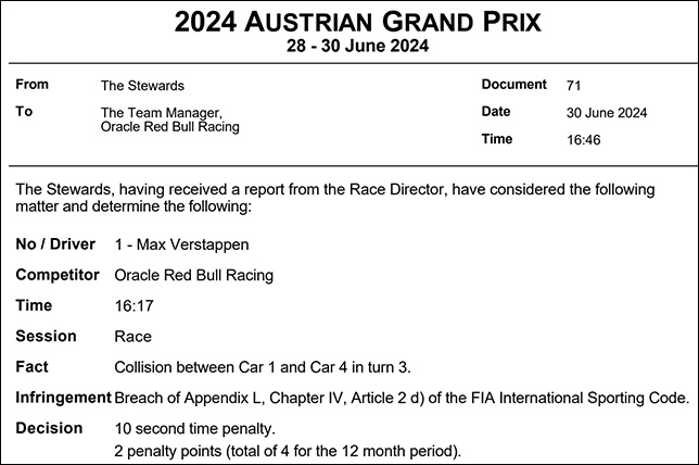 10-секундный штраф и два штрафных балла получил и Макс Ферстаппен за инцидент с Ландо Норрисом – у Макса 4 балла за последние 12 месяцев.