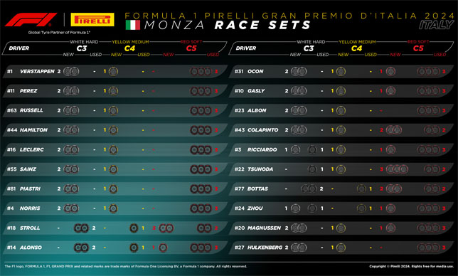 Перед стартом Гран При Италии пресс-служба Pirelli опубликовала информацию об оставшихся у гонщиков комплектах шин.