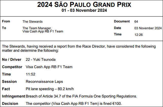 Оба нарушения были незначительными – 80,2 км/ч вместо разрешённых 80 км/ч. В сумме стюарды оштрафовали команду RB на 200 евро.