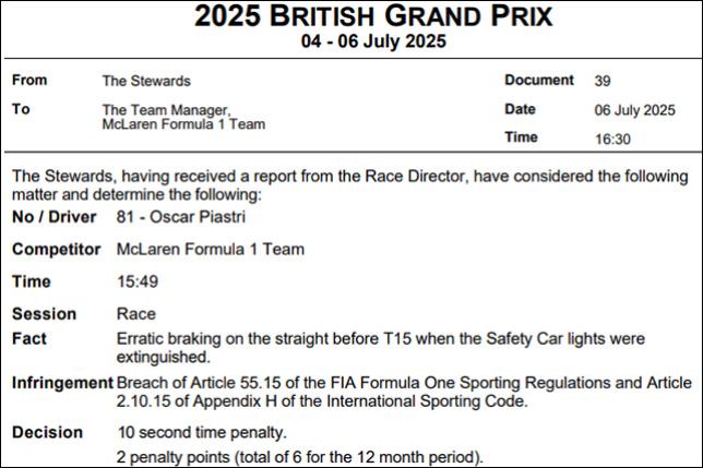 По ходу гонки в Сильверстоуне двое гонщиков получили от стюардов по 10-секундному штрафу – Юки Цуноду признали виновником столкновения с Оливером Берманом, а Оскар Пиастри нарушил правила автомобиля безопасности, слишком резко затормозив перед рестартом.