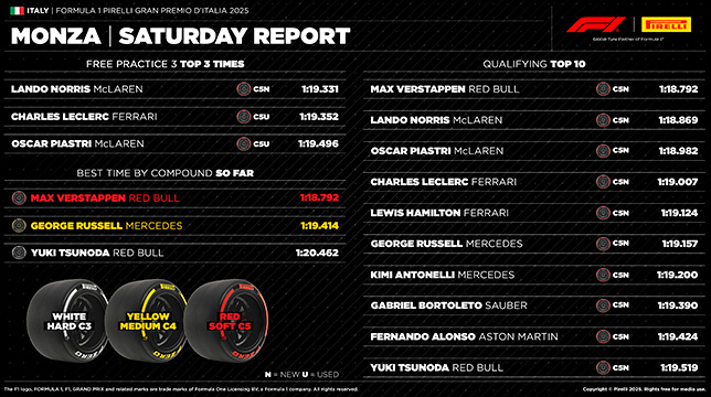 Самыми быстрыми в квалификации были шины Soft, хотя и те, кто выбрал Medium, как пилоты Mercedes в первой сессии, тоже оказались конкурентоспособны. Джордж Расселл показал лучшее время в первой сессии на шинах C4, но это скорее связано с тем, что он чувствовал себя более комфортно с резиной, которая, хоть и менее быстрая, обеспечивает гонщику большую уверенность.