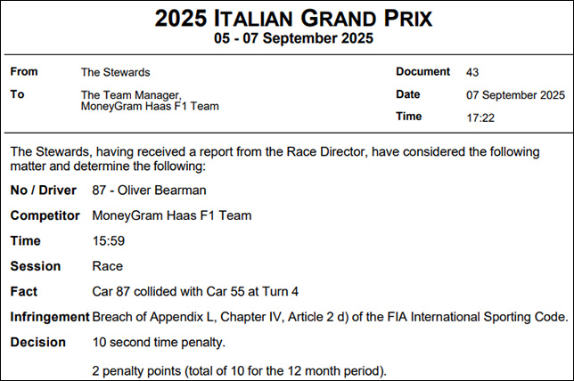 Рассмотрев обстоятельства борьбы за позицию Оливера Бермана и Карлоса Сайнса в четвёртом повороте, которая закончилась двойным разворотом, но не привела к сходу, стюарды Гран При Италии наказали гонщика Haas F1 не только 10-секундным штрафом, но и двумя штрафными баллами к суперлицензии.