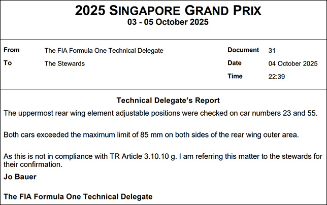 После сессии технический инспектор проверил положение верхнего элемента заднего антикрыла на машинах с номерами 23 и 55. В обоих случаях разрешённый предел в 85 мм был превышен, что является нарушением статьи 3.10.10 g. Вопрос передан на рассмотрение стюардам.