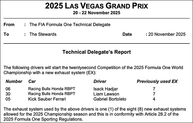 Айзек Хаджар и Лиам Лоусон получили восьмую за сезон выхлопную систему при восьми разрешённых, Габриэль Бортолето – пятую. Никаких санкций за этим не последует.