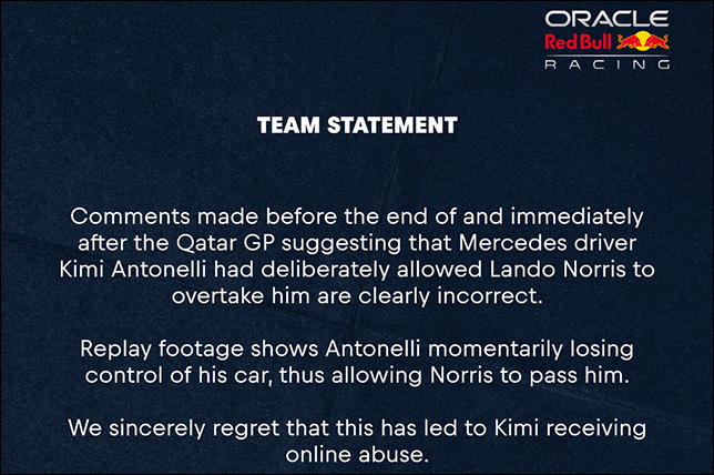 На записи видно, что Антонелли ненадолго потерял контроль над машиной, позволив Норрису обогнать себя. Мы глубоко сожалеем, что это привело к оскорблениям в адрес Кими в интернете», - сказано в заявлении Red Bull.