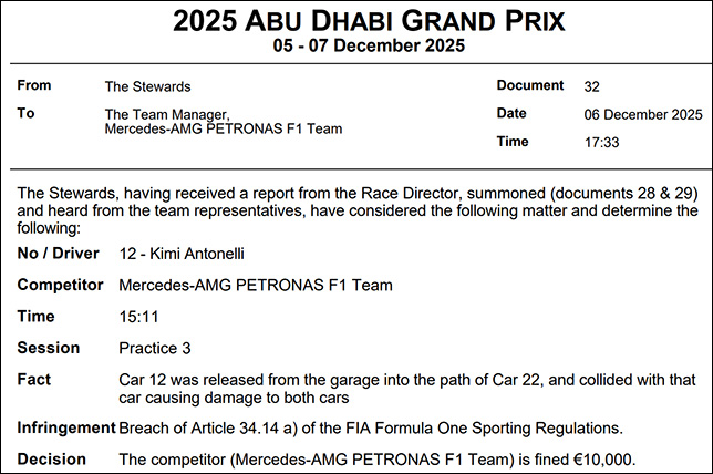 Проанализировав обстоятельства этого инцидента, стюарды Гран При Абу-Даби признали вину Mercedes в небезопасном выезде гонщика и наложили денежный штраф в 10000 евро.