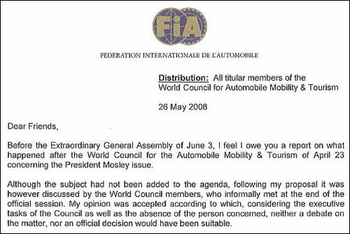 В письме речь идет о компромиссе, который может стать выходом из ситуации, связанной с предстоящим голосованием Генеральной Ассамблеи по поводу отставки Мосли. Предложение WCAM&T пересекается с письмом президента японской национальной федерации, и состоит в следующем: Мосли должен письменно заявить о своем намерении добровольно уйти в отставку с 1 ноября 2008 года, а до тех пор останется на своем посту.