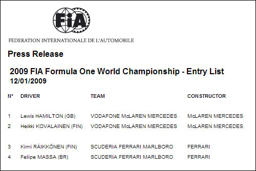 Международная федерация автоспорта опубликовала официальный список участников чемпионата мира 2009 года. В него, под прежним названием, включена и Honda Racing, которая пока ищет нового владельца...