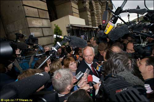 Утром на площади Согласия в Париже журналисты встречали участников внеочередного заседания. Делегацию Renault, как и планировалось, возглавили президент команды Бернард Рей и директор компании по связям с общественностью Жан-Франсуа Кобе, приехали Фернандо Алонсо, Нельсон и Нельсиньо Пике, и множество юристов. Берни Экклстоун сделал короткое заявление для прессы...
