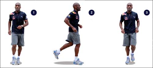 2 - Перемещая руки вдоль тела, способствуйте естественным поворотам верхней части корпуса. В этом случае усилия не столь высоки, как при беге без отклонений тела, который очень перегружает ноги.