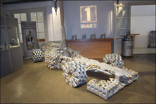 Два мастера из компании Smeerolie Arts Collective, по заказу ExxonMobil, изготовили модель формульной машины Mobil 1 Grand Prix Car из более, чем 1200 канистр моторного масла Mobil 1 New Life.