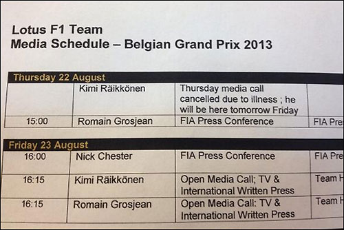 Увы, в четверг, когда у журналистов есть возможность встретиться с гонщиками, Кими в паддоке не будет: пресс-служба команды объявила, что он заболел и появится только завтра. Диагноз не называется, но раз Райкконен сядет за руль Lotus E21 уже на пятничных тренировках, то, видимо, особых поводов для волнений нет.