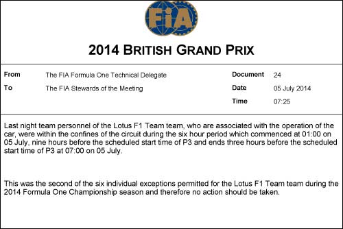 В Сильверстоуне в ночь на субботу Lotus F1 Team нарушила правило комендантского часа – сотрудники команды продолжали работу с машинами в период с часа ночи до семи утра, что запрещено регламентом.
