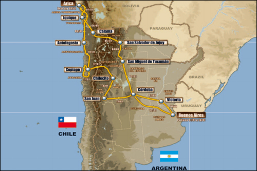 Организаторы обещают, что маршрут будет сложнее прошлогоднего – после старта в аргентинской столице караван участников возьмёт курс на север страны, затем попетляет по бездорожью Чили, а после традиционного дня отдыха, намеченного на 8 января, двинется в обратный путь на Буэнос-Айрес, где 16-го числа гонка финиширует. Главные трудности спортсменов ждут во время пересечения знаменитой пустыни Атакама и Андийских Кордельеров.